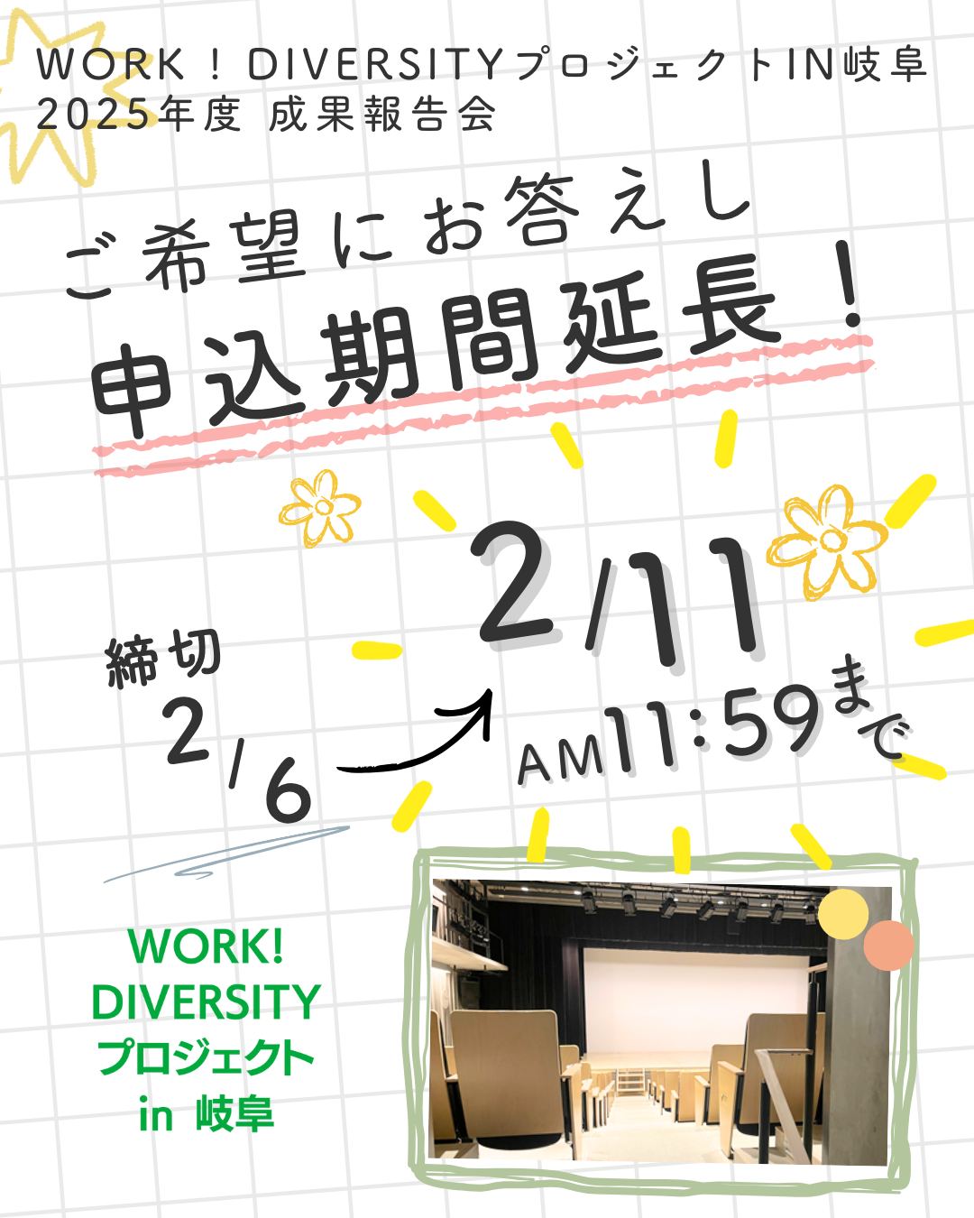 2/12(木)開催の「WORK! DIVERSITY プロジェクト in 岐阜 成果報告会」ですが、申込期限を過ぎた現在もお問合せをいただいております。大変多くの反響をいただきまして、誠にありがとうございます!